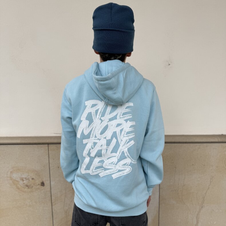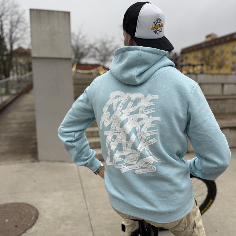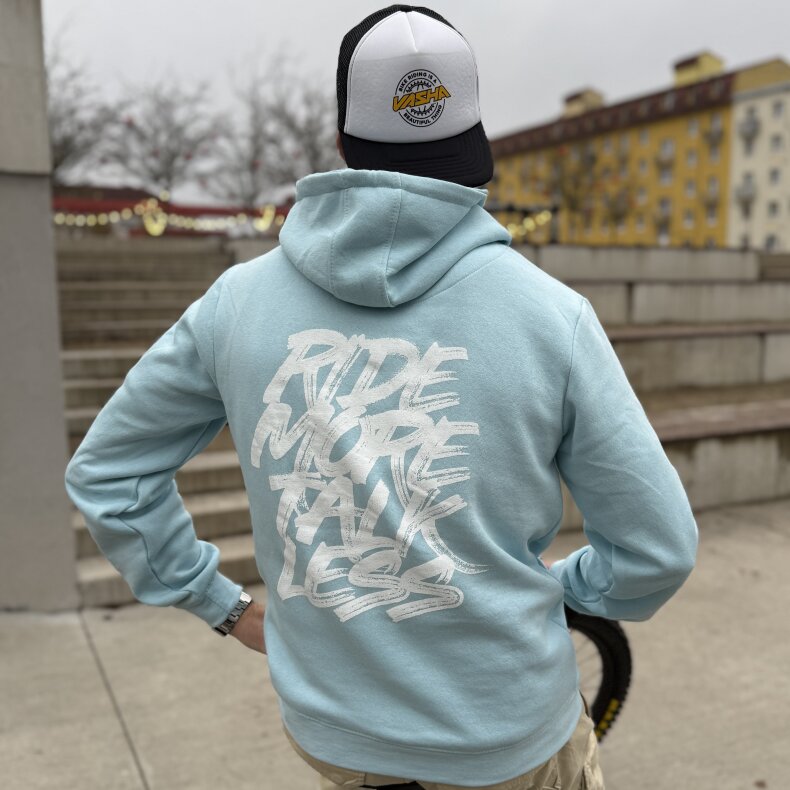 Mikina Vasha "Ride More Talk Less" – Mega cool, kvalitní mikina s kapucí v barvě světlemodrá (Oceanblue), vepředu s jednoduchým logem Vasha a vzadu velký nápis "Ride More Talk Less" v překladu "Víc jezdi, míň mluv". Mikina je pohodlná, super příjemný materiál, vhodná pro děti i dospělé v několika velikostech. Tohle je Vaškova nová mikča, kterou prostě musí mít každý stylový rider, který miluje ježdění na kole a chce posouvat svoje bike skills.