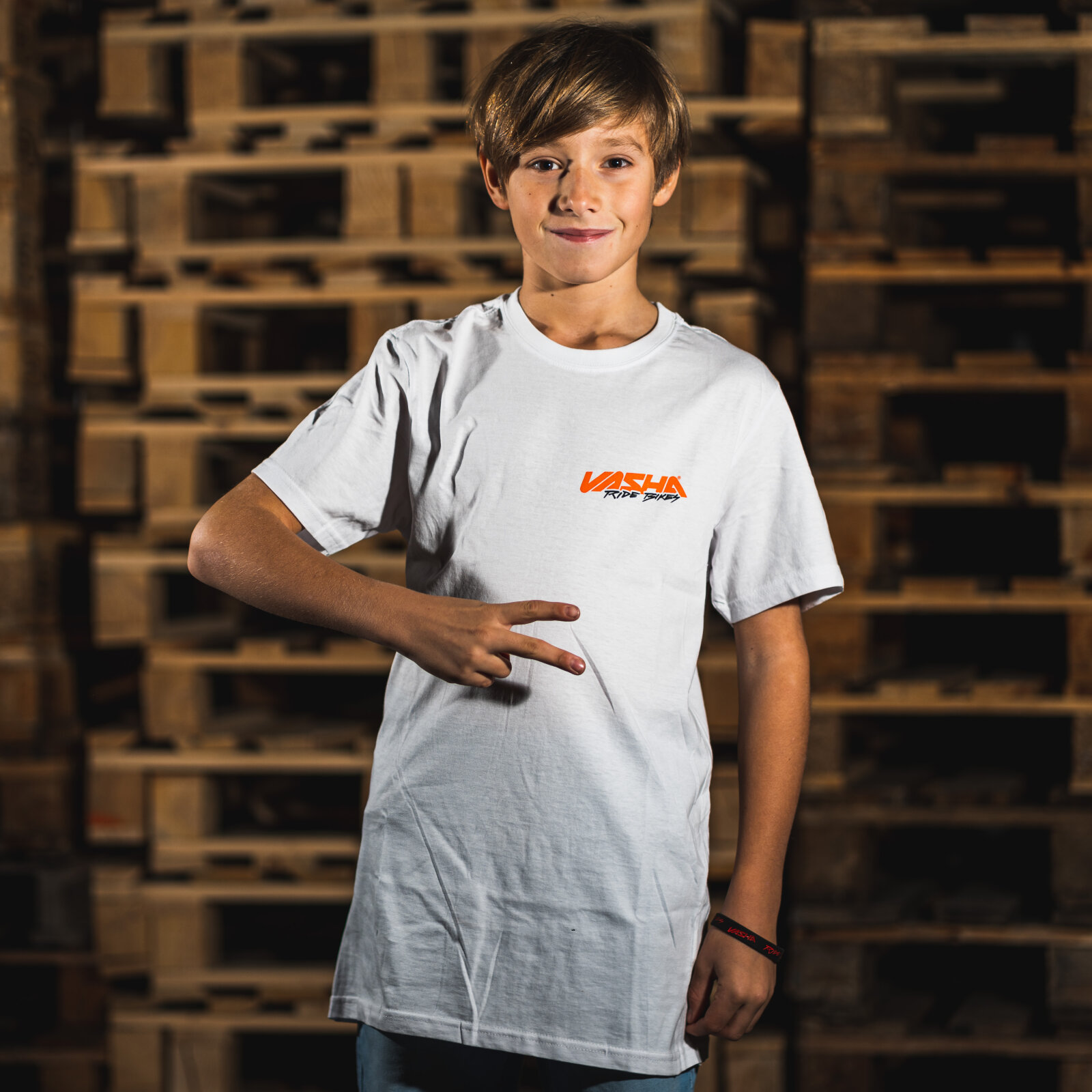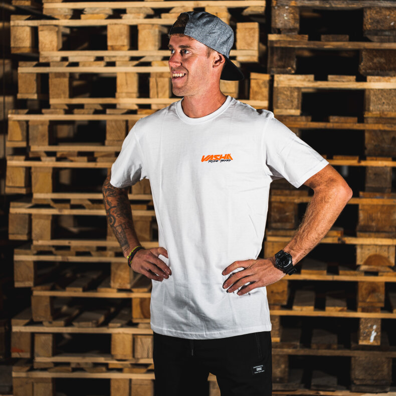 Tričko Vasha "Signature" – Triko v bílé barvě, vepředu s jednoduchým logem a vzadu s oranžovým rozprsklým nápisem Vasha přes celé záda, které může připomínat páteř. Tohle je Vaškovo oblíbené triko, a proto ho pojmenoval "signature". Design vymyslel šikovný grafik Oula.